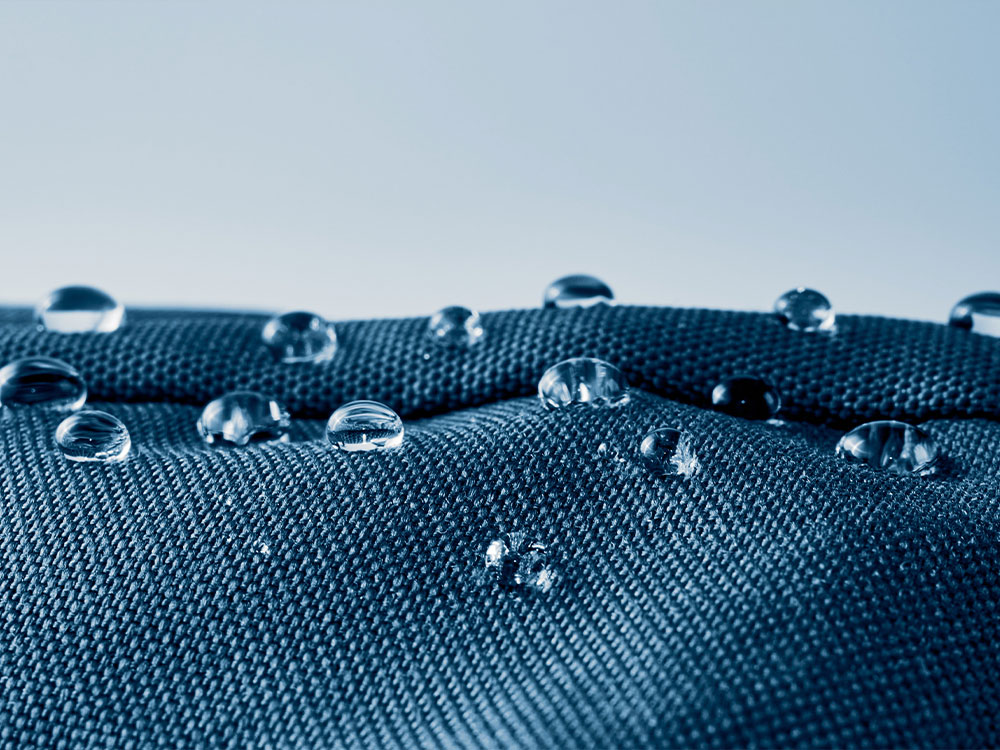 防潑水加工:使其表面具有撥水效果,讓水珠從表面滑落,而不是滲透進入衣物。 防水加工:有效阻擋水滲透。 防水透濕加工:能防雨水穿透又能將汗液蒸氣排出的布料。